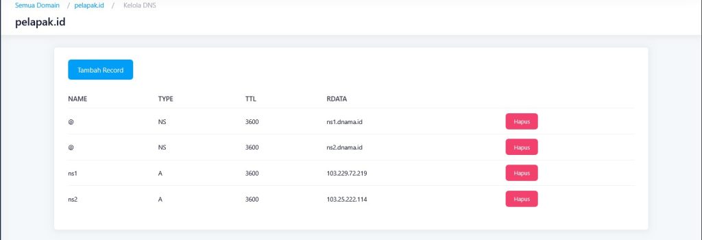 Input data DNS management dengan klik ” Tambah Reocrd “dan pastikan untuk a record diarahkan sesuai dengan IP pada child DNS yaitu NS1. 103.229.72.219 dan NS2. 103.25.222.114.